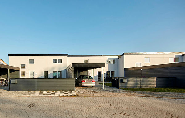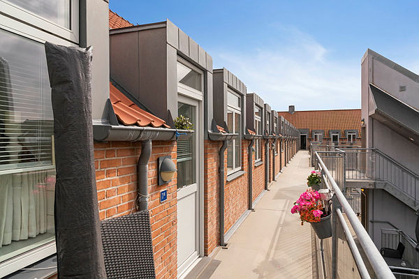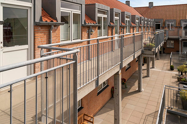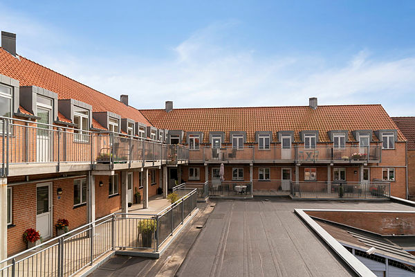 Den let beplantede gård er forbeholdt parkering, hvorfra der er adgang til boligerne på 1. og 2. sal via enten trapper eller elevator. Fra boligerne er der adgang til tagterrasse og altangang. Der er depotrum og gildesal.